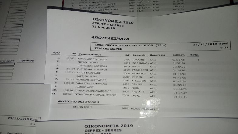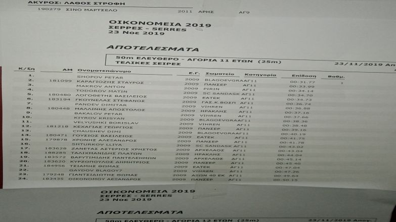 Στις 23 Νοεμβρίου πραγματοποιήθηκαν τα ΟΙΚΟΝΟΜΕΙΑ 2019 στις Σέρρες με την συμμετοχή πολλών ομάδων και τριών από την Βουλγαρία με πολύ δυνατούς αθλητές. Η ομάδα μας πήρε μέρος για πρώτη φορά σε 25μ. πισίνα και απέδειξε για ακόμη μια φορά ότι η σωστή δουλειά σε συνεργασία με την θέληση και την ψυχική δύναμη των παιδιών μπορεί να φέρει καρπούς. Συγχαρητήρια στον αθλητή μας Στέφανο Γκουνέλα για τις θέσεις που πήρε στα 100μ. Πρόσθιο ( 4ος ) και στα 50μ. Ελεύθερο ( 6ος ) με εκπληκτικούς χρόνους.